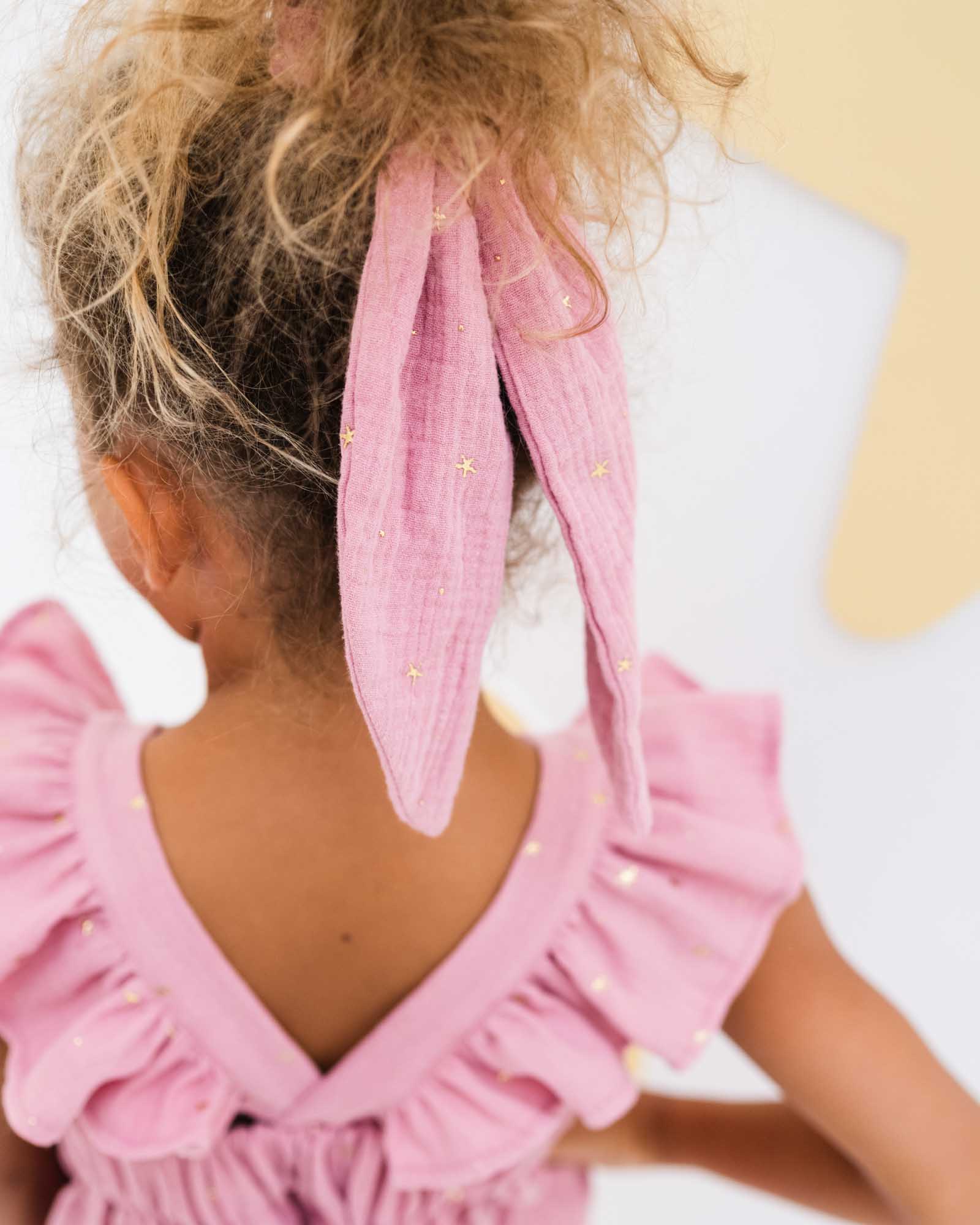 baby girl of 12 months wearing the Rose romper in  soft pink in soft organic muslin cotton