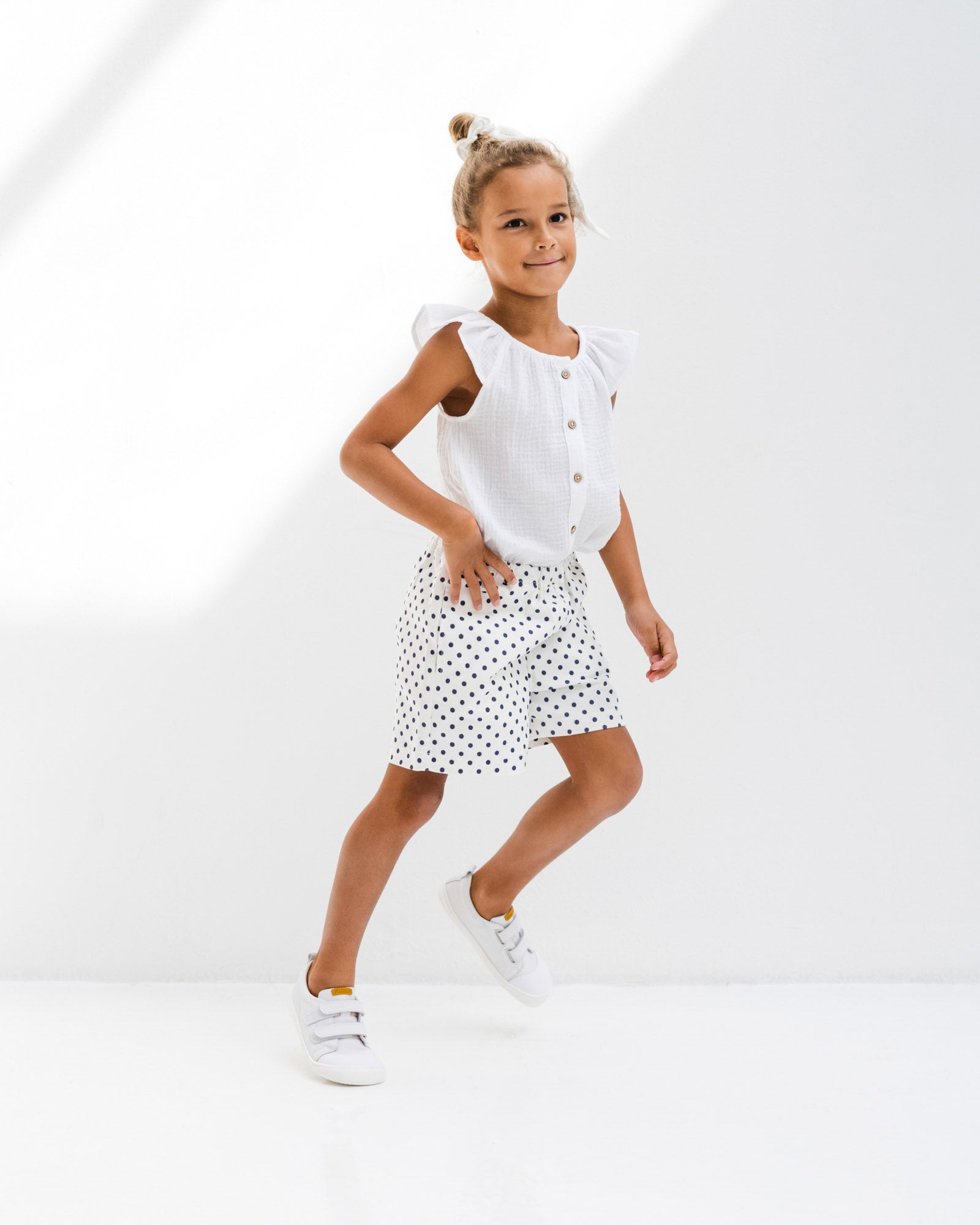 5-year-old girl showing the outfit on a white background, is wearing size 116-122cm