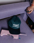Top off any outfit with this bold navy and green cap featuring our uplifting Happy Human quote. Designed for sunny adventures and everyday play, this adjustable cap offers a comfy fit for kids — and yes, grown-ups can join in on the fun too. A joyful message with a cool, color-blocked twist.