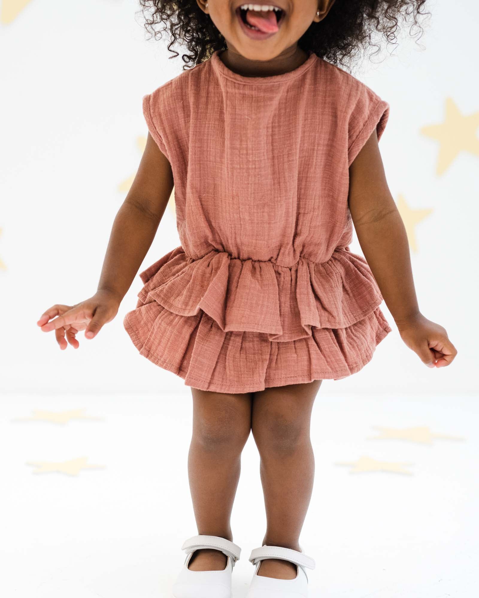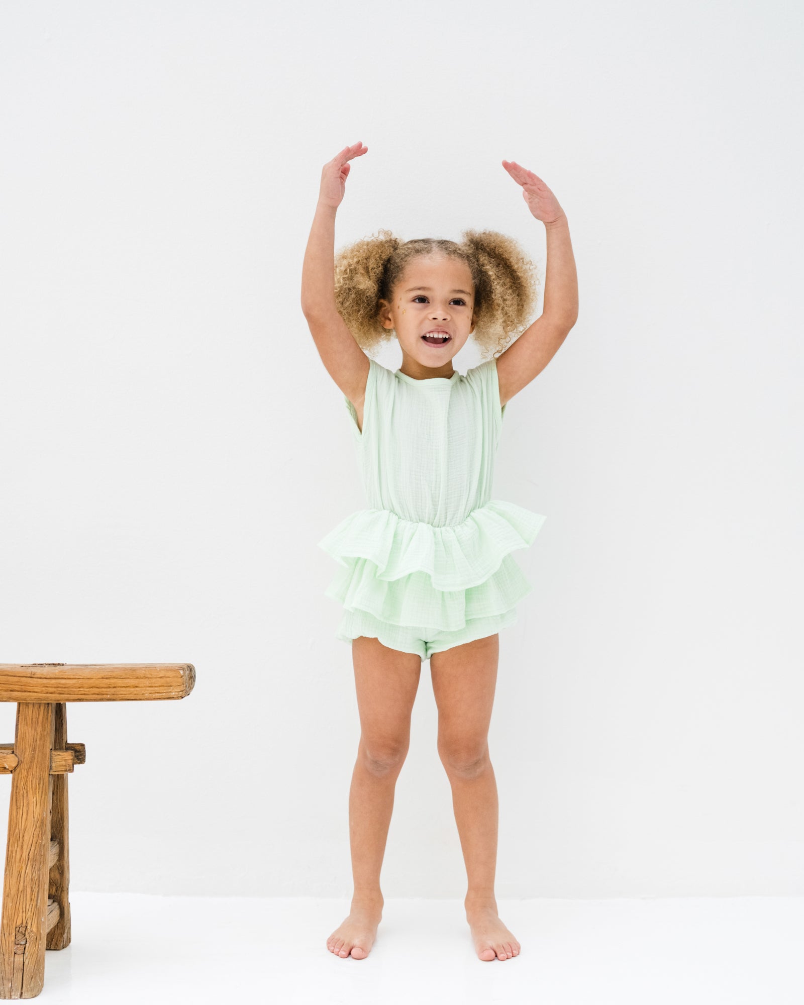sleeveless baby romper with 2 layered ruffle tiers around the waist