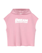 This cropped sleeveless hoodie in vibrant polignac pink is made for bold, confident style. Featuring “Dream Team” in big white letters across the front, it brings an energetic, sporty vibe to any look. With its relaxed fit and soft fabric, it’s perfect for layering or wearing on warmer days—ideal for girls who love comfort with a statement.